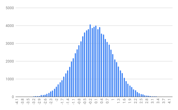 乱数なので少しばらつきがありますが、ほぼ正規分布になっていることが分かります。