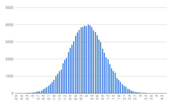一つだけ生成しても実際に正規分布になっているかどうか分からないので、100,000個の乱数を生成して小数第二位で四捨五入し、度数を数える以下のようなプログラムを作ってみました。